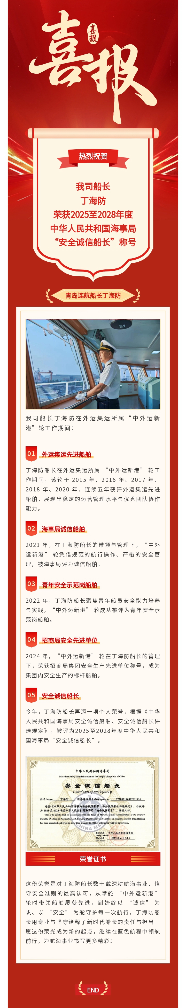 我司船長丁海防榮獲“安全誠信船長”稱號(hào)